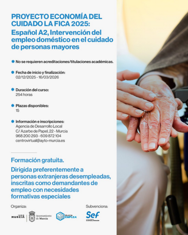 Destinatarios: | DIRIGIDO A: Personas inmigrantes del municipio de Murcia, desempleadas e inscritas en los Servicios Públicos de Empleo, con necesidades especiales de formación y dificultades para su integración en el mercado de trabajo. REQUISITOS: Sin requisitos académicos. Conocimientos mínimos de español. |