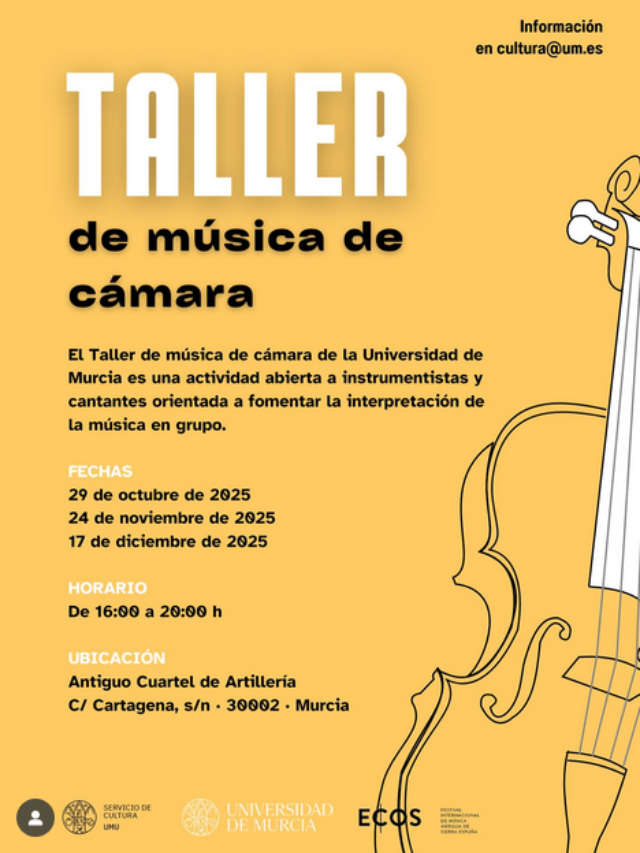 Si eres músico clásico, tocas en un grupo de cámara o quieres tocar en uno, este es tu lugar. El taller está abierto tanto a estudiantes de la UMU como a toda persona interesada en la música de cámara. Además, participar suma horas al recuento de ECTS-CRAU.