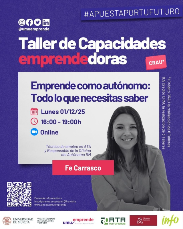 Inscripción: https://eventos.um.es/142956/tickets/emprende-como-autonomo-todo-lo-que-necesitas-saber.html