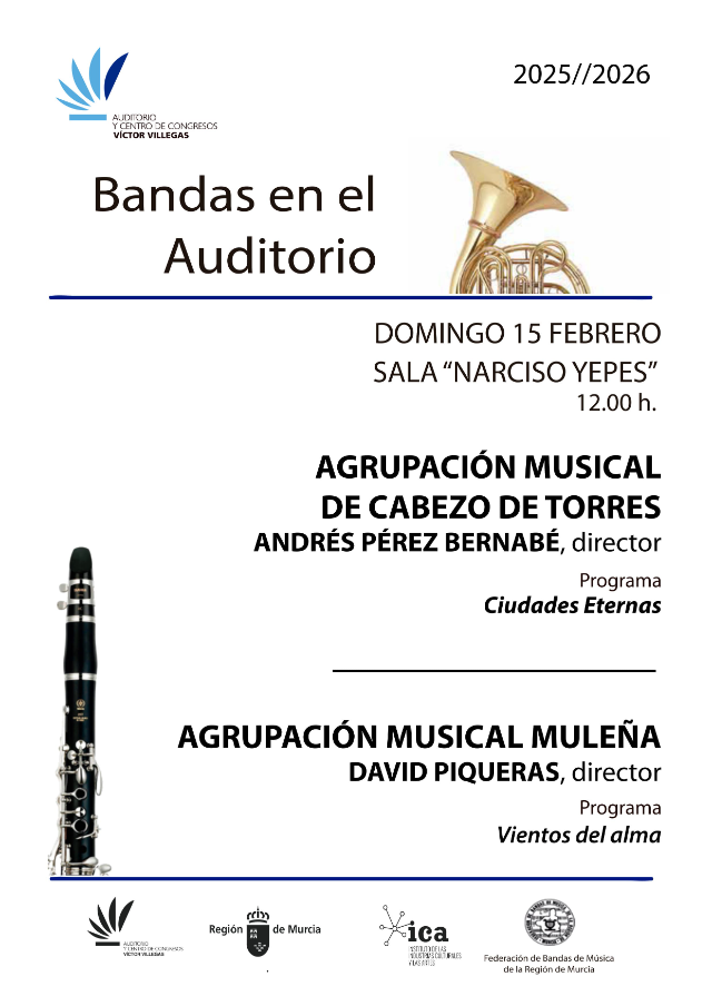 El domingo día 15 de febrero de 2026, a las 12:00, la Banda Sinfónica de la Agrupación Musical de Cabezo de Torres dirigida por Andrés Pérez Bernabé ofrecerá en la Sala Narciso Yepes del Auditorio y Centro de Congresos Víctor Villegas de Murcia dentro del Ciclo de Bandas en el Auditorio un Concierto cuyo programa se denomina «Ciudades Eternas».