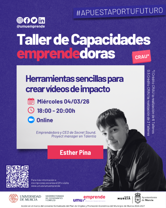 El miércoles 4 de marzo de 2026 de 18:00 a 20:00h tendrá lugar este taller de emprendimiento.