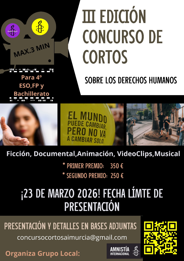 PLAZO Y LUGAR DE PRESENTACIÓN: Entrarán en concurso los trabajos presentados hasta el 23 de marzo de 2026. Los trabajos pueden ser enviados por correo electrónico a la dirección concursocortosaimurcia@gmail.com, con el nombre del Derecho Humano al que hace referencia la obra presentada.