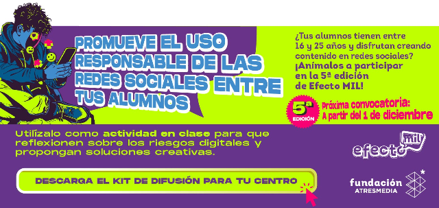 Sólo tienes que inscribirte en https://efectomil.org/ y crear un vídeo de menos de un minuto para redes sobre alguno de los riesgos digitales propuestos: peligros de los retos virales, acoso en redes sociales, discurso de odio, fake news o adicción a las redes sociales, concienciar sobre los riesgos digitales y proponer soluciones creativas.