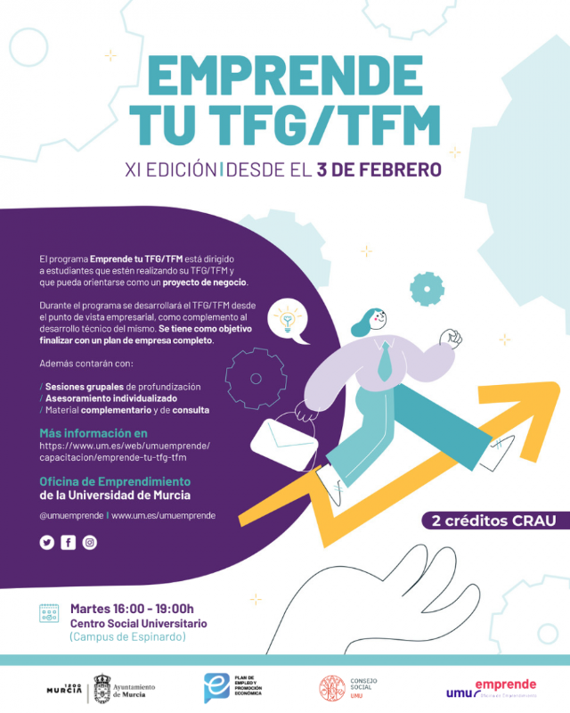 El programa “Emprende tu TFG/TFM” está dirigido a estudiantes que estén realizando su TFG/TFM y que pueda ser planteado como un proyecto de negocio. Durante el programa se desarrollará el TFG/TFM desde el punto de vista empresarial, como complemento al desarrollo técnico del mismo. Se tiene como objetivo finalizar con un plan de empresa completo.