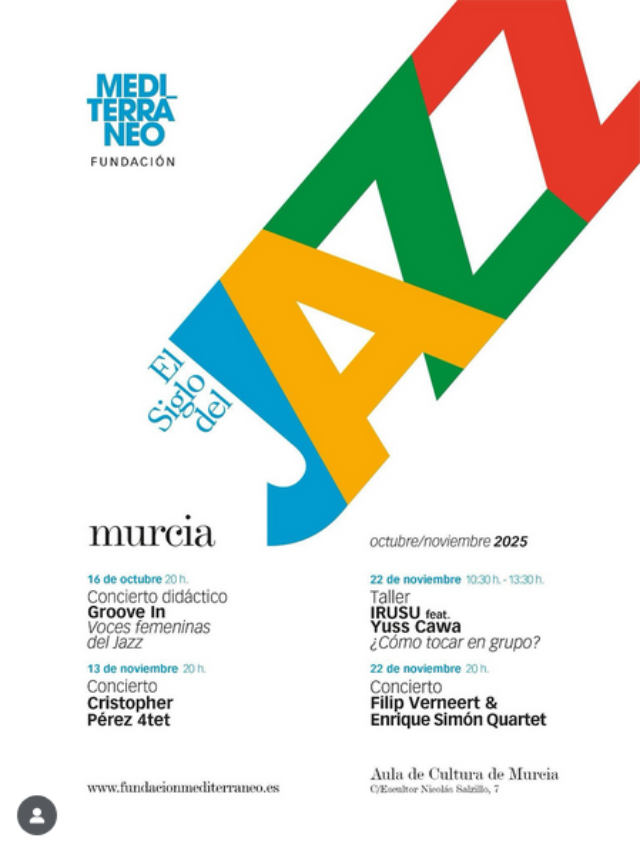 Un ciclo para descubrir y celebrar la historia, el presente y el futuro del jazz a través de conciertos, experiencias en vivo y actividades formativas. Esta edición rinde homenaje a las grandes voces femeninas del género con un concierto didáctico de Groove In, da paso al talento emergente con Christopher Pérez 4tet, y ofrece herramientas prácticas para músicos con el taller de IRUSU feat. Yuss Cawa. Como cierre, el concierto internacional de FVES QUARTET, liderado por Filip Verneert y Enrique Simón, fusiona tradición y modernidad en una propuesta de alto nivel. Una invitación a sumergirse en la riqueza y vitalidad del jazz en todas sus formas.