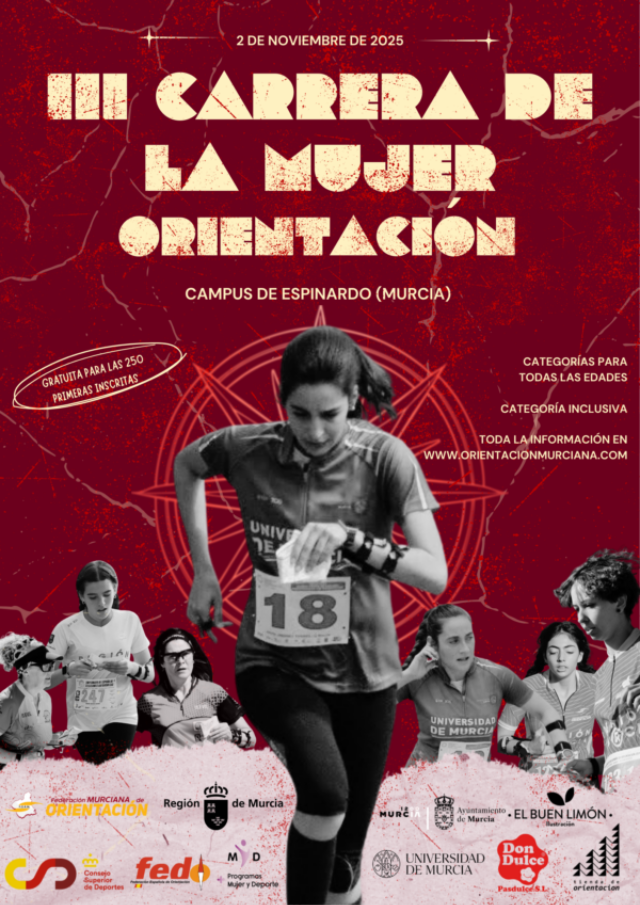 III Carrera de la Mujer de Orientación. Este año vuelve con esta cita en un enclave perfecto para iniciarse en este deporte, el Campus de Espinardo de la Universidad de Murcia. El 2 de noviembre se podrá disfrutar de un mapa super divertido en el que correr sola o en grupo.