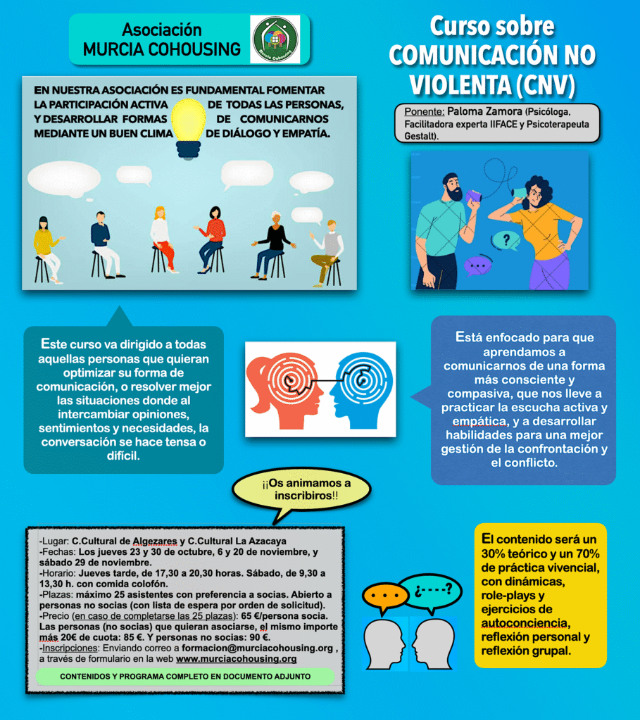 Organizado por la Asociación Murcia Cohousing, tendrá lugar los jueves 23 y 30 de octubre, 6 y 20 de noviembre, de 17:30 a 20:30, y se completará el sábado 29 de noviembre, de 9:30 a 13:30.