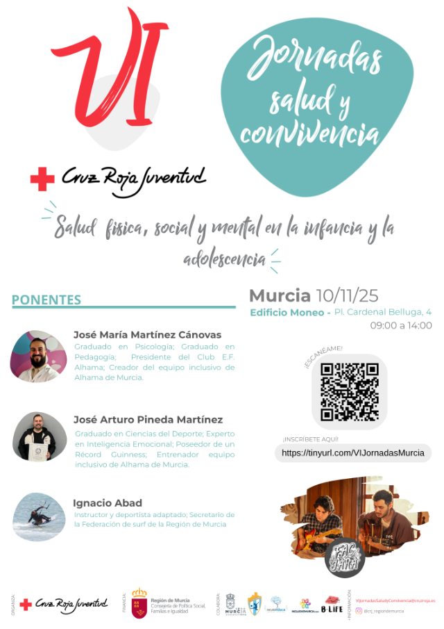 Organizadas por Cruz Roja Juventud Región de Murcia, estas jornadas serán un espacio de encuentro, aprendizaje y reflexión en torno al papel del deporte como herramienta de promoción de la salud, convivencia e inclusión social. Contaremos con ponencias y momentos para compartir experiencias entre asistentes y profesionales.