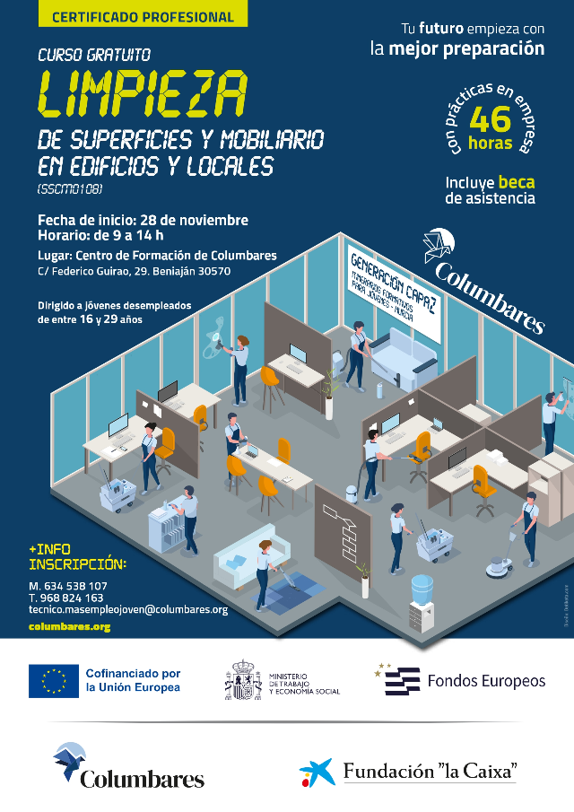 Certificado Profesional en Limpieza de Superficies y Mobiliario en Edificios y Locales. Inicio: 28 de noviembre | Duración: 230 horas  Programa +Empleo Joven – Fundación “la Caixa” Requisitos:
