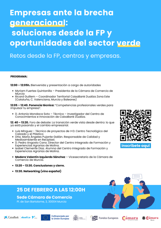 La Cámara de Comercio de Murcia, en colaboración con CaixaBank Dualiza, organiza la segunda edición de la jornada “Empresas ante la brecha generacional: soluciones desde la FP y oportunidades del sector verde”, un espacio de reflexión y análisis dirigido a empresas y profesionales.