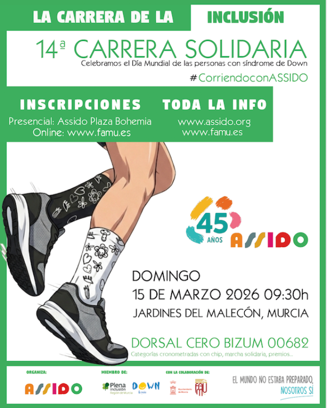 Vuelve la cita favorita: la 14ª Carrera Solidaria de ASSIDO. Este año corremos con más fuerza que nunca para celebrar el Día Mundial de las personas con síndrome de Down y el 45 aniversario de la asociación.