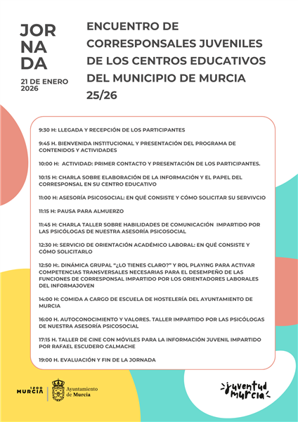 El pasado miércoles, 21 de enero celebramos el Encuentro de Corresponsales Juveniles de los IES del municipio de Murcia del curso 2025/26 2026 del Informajoven, con una jornada en el Espacio Juvenil 585m2 en la que realizamos diferentes charlas, talleres y dinámicas grupales, para los corresponsales de este curso conozca nuestro servicio de Asesoría Psicosocial y de Orientación Académico-Laboral.
